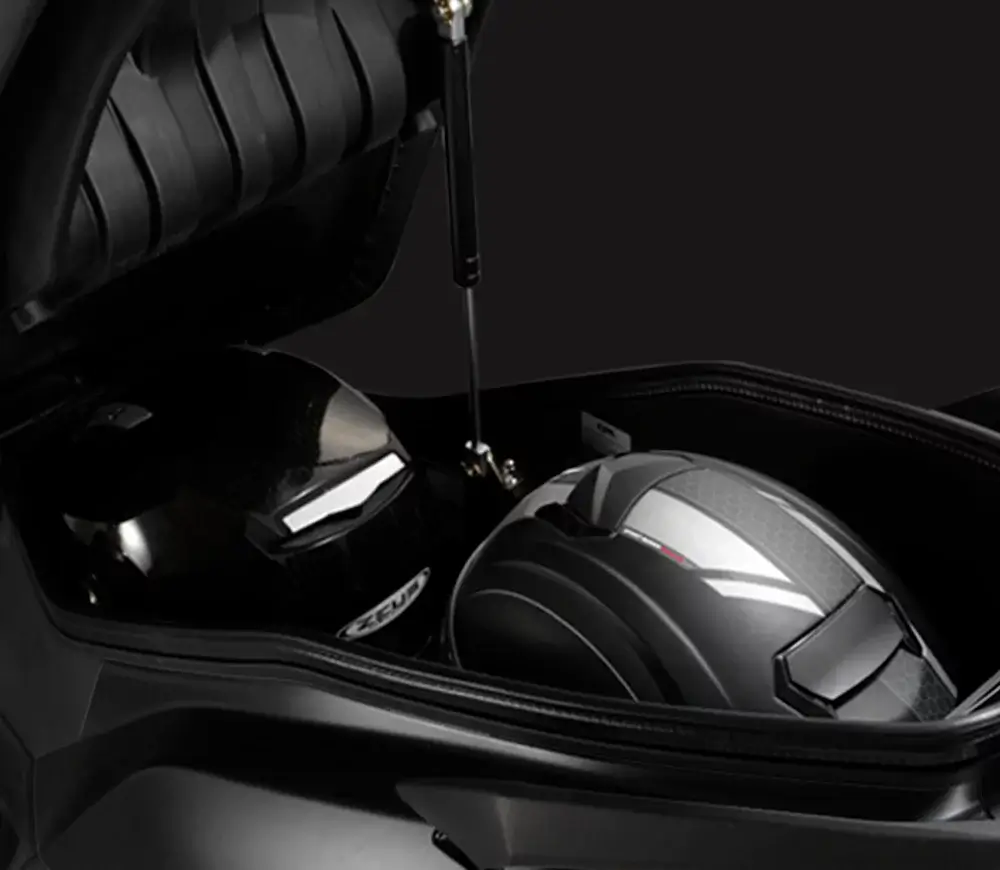 Espacioso compartimento bajo el asiento con capacidad de 45 litros, diseñado para ofrecer la máxima funcionalidad sin comprometer el diseño del vehículo. Este espacio permite alojar cómodamente dos cascos integrales, lo que lo convierte en una opción ideal tanto para uso diario como para desplazamientos más largos